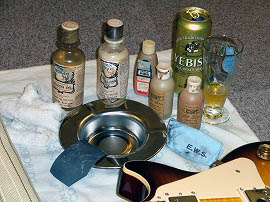 後ろ左から・・ 雑巾 トレス・アミーゴスの レモン・オイル カルナバ・ワックス アクリサンデー研磨剤 (ピカール金属磨き より 量が少ないので、こちらをお勧めします。) WONDER GLOW 3 (この写真では 2種類ですね・・ 本当は 3種類有ります。) YEBISU (こういう 真夜中の 一人の 作業には かかせません!) 1600番の耐水ペーパー 灰皿(水を入れてある) EWS POLISHING CARE CLOTH(金属パーツ用) |
